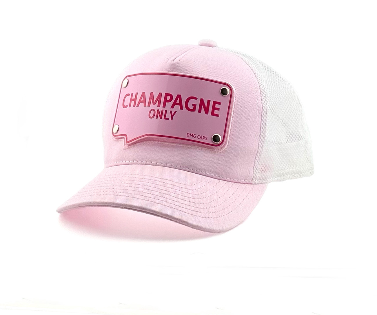 Ta pudrowo – biała czapka „CHAMPAGNE ONLY” typu truckerka to połączenie stylu i luzu – zdobi ją błyszcząca, metalowa blaszka z odważnym napisem.