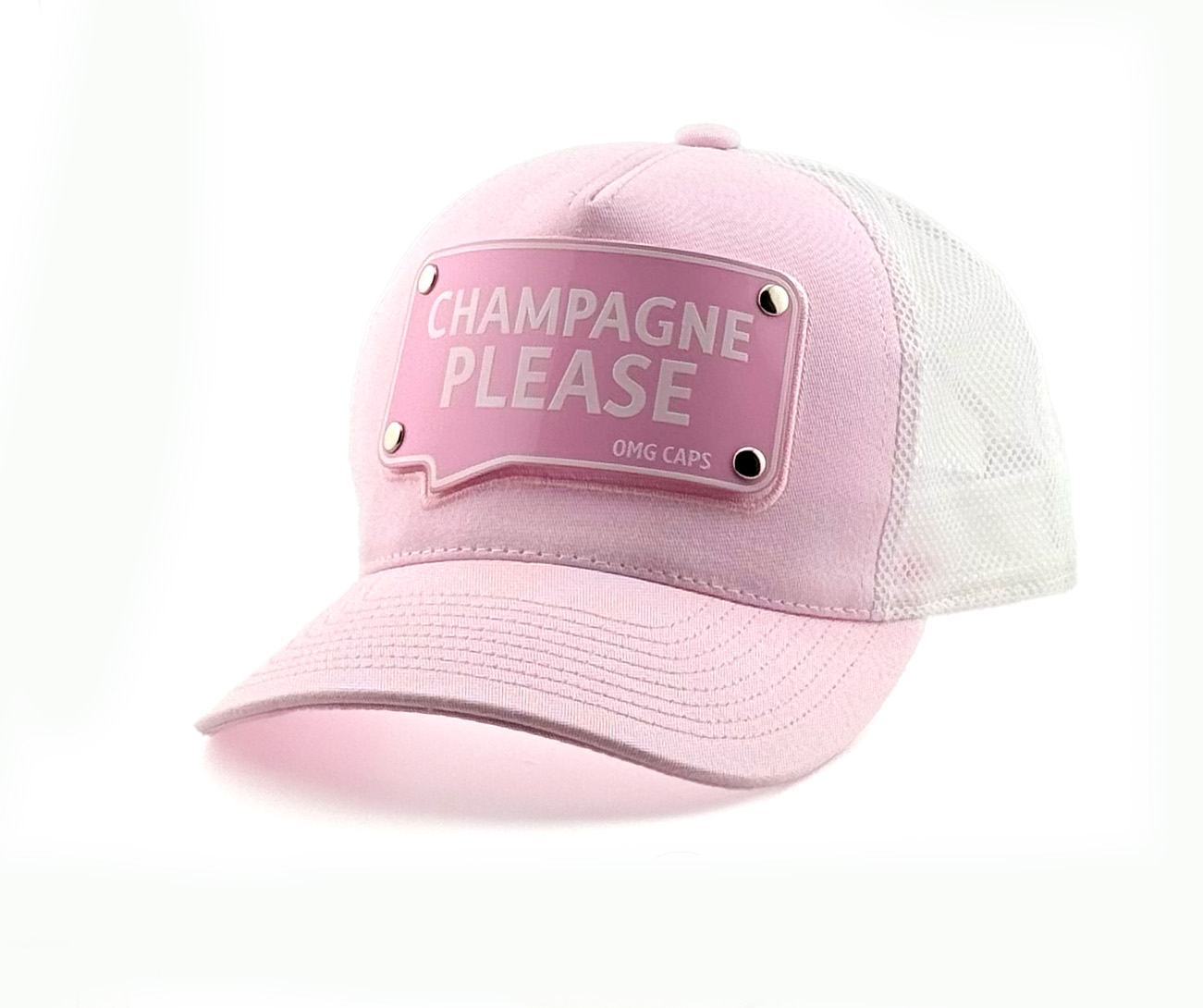 Ta pudrowo – biała czapka „CHAMPAGNE PLEASE” typu truckerka to połączenie stylu i luzu – zdobi ją błyszcząca, metalowa blaszka z odważnym napisem.
