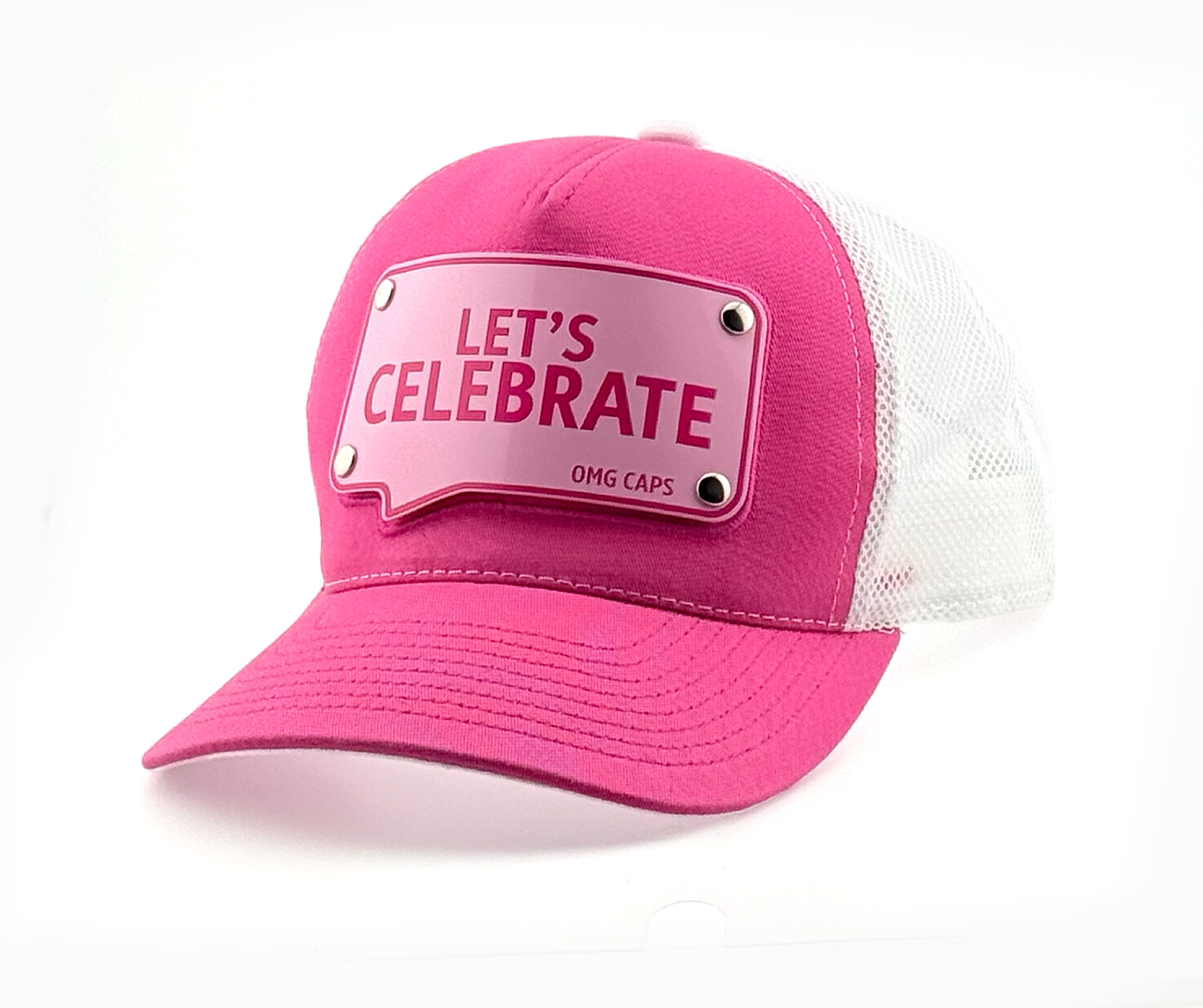 Ta różowo – biała czapka „LET’S CELEBRATE” typu truckerka to połączenie stylu i luzu – zdobi ją błyszcząca, metalowa blaszka z odważnym napisem.