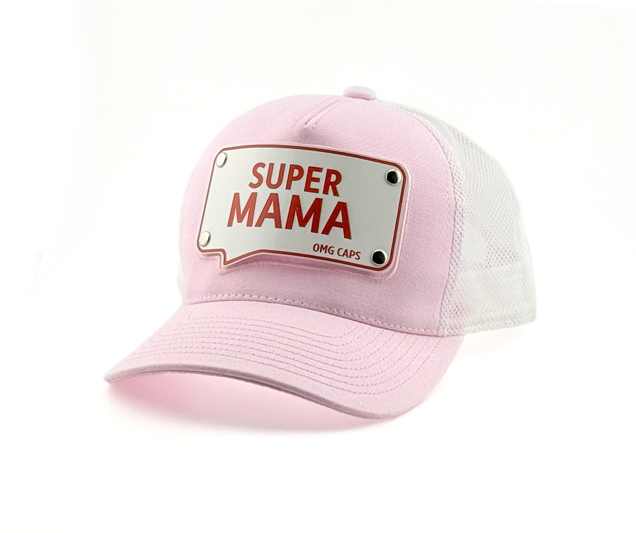Ta różowo – biała czapka „Super Mama” typu truckerka to połączenie stylu i luzu – zdobi ją błyszcząca, metalowa blaszka z odważnym napisem.