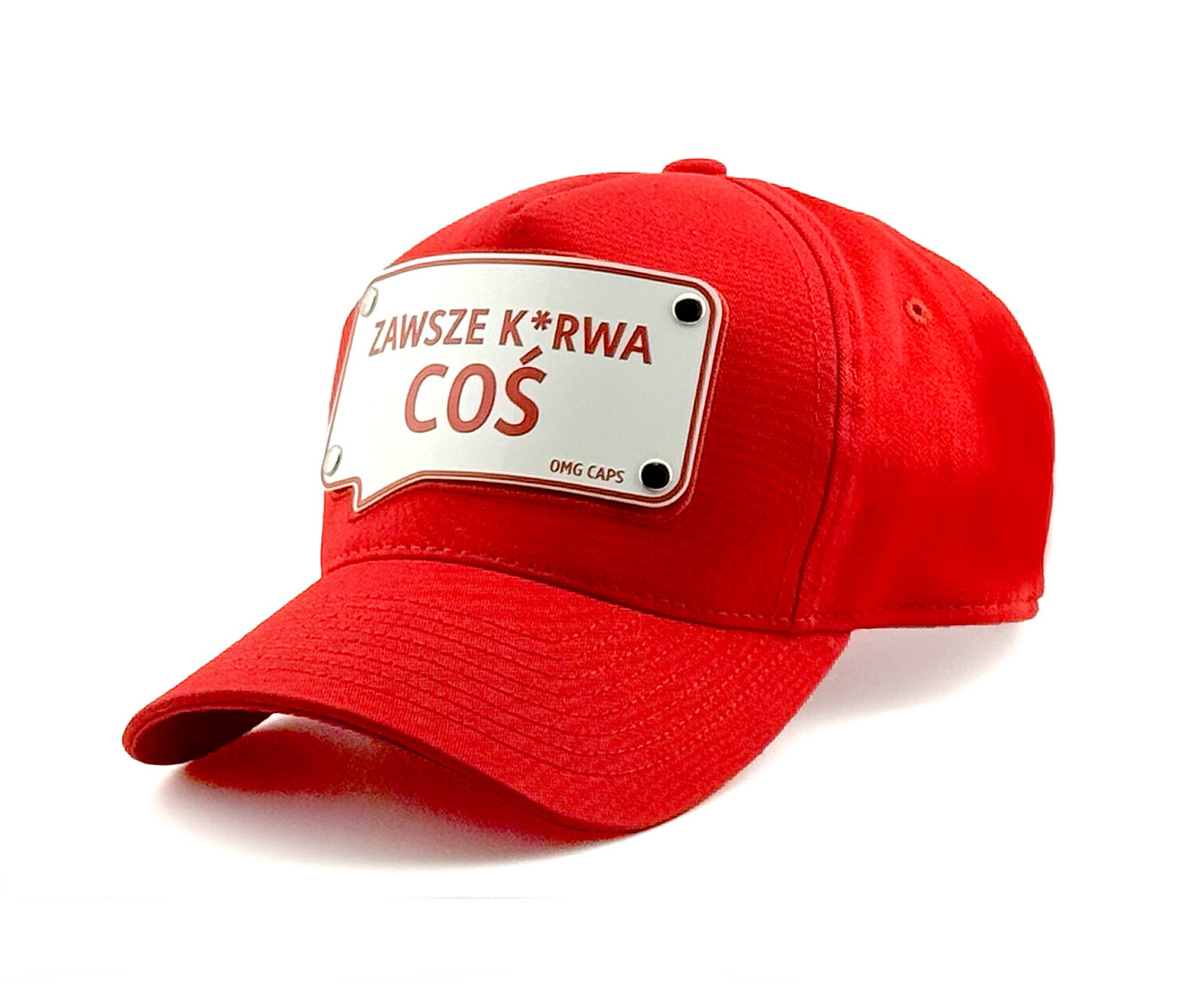 Ta czerwona czapka „Zawsze k*rwa coś” to połączenie stylu i luzu – zdobi ją błyszcząca, metalowa blaszka z odważnym napisem.